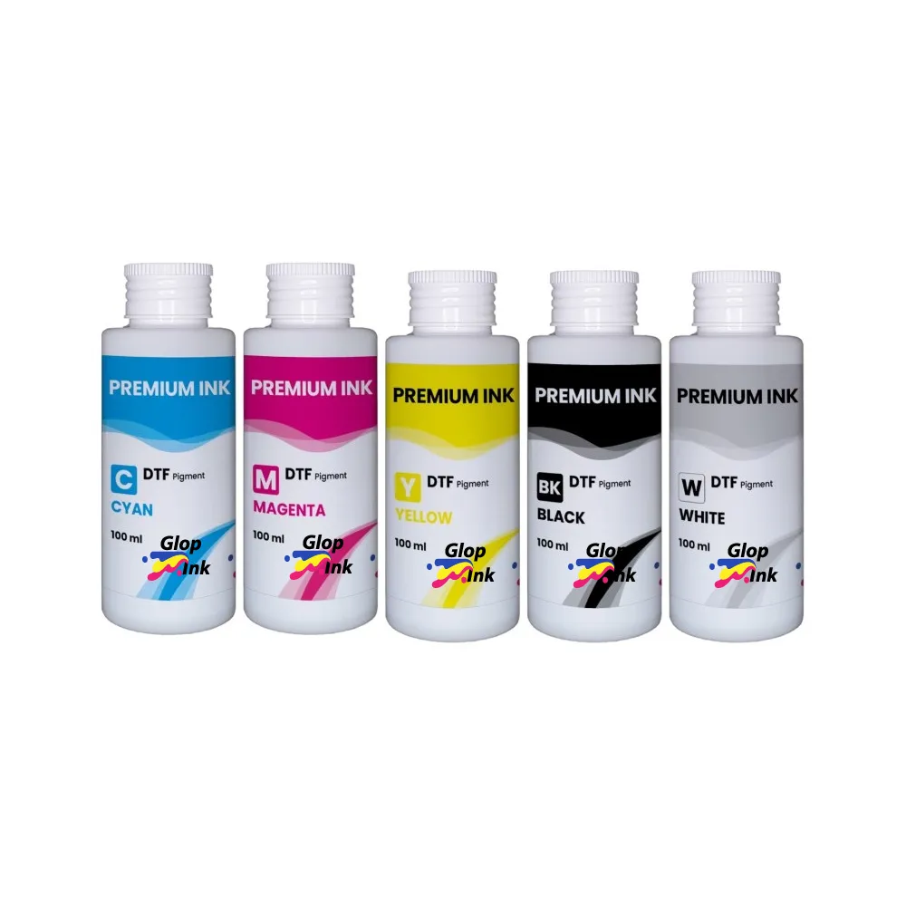 El pack de 5 botellas de 100 ml de tinta DTF GlopInk está diseñado para plotters DTF e impresoras de escritorio compatibles con DTF y DTF4P, así como para impresoras DTF industriales y Epson EcoTank modificadas a DTF.