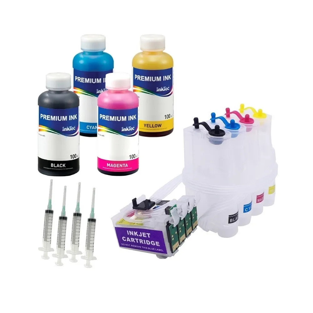 CISS 27XL avec réinitialisation automatique et 4 bouteilles d'encre compatible InkTec de 100 ml pour imprimantes Epson WorkForce WF-7210, WF-7710, WF-7715, WF-7220, WF-7110, WF-7610, WF-7620, WF-3620, WF-3640.