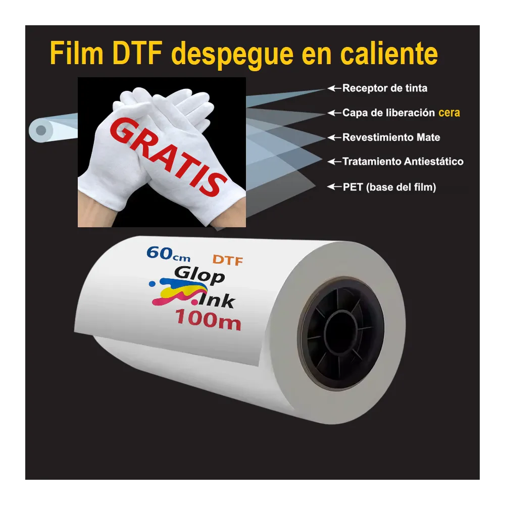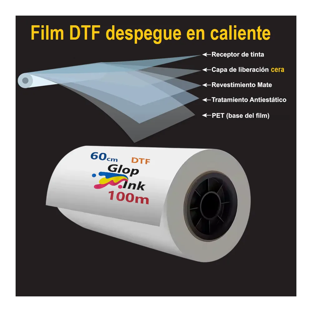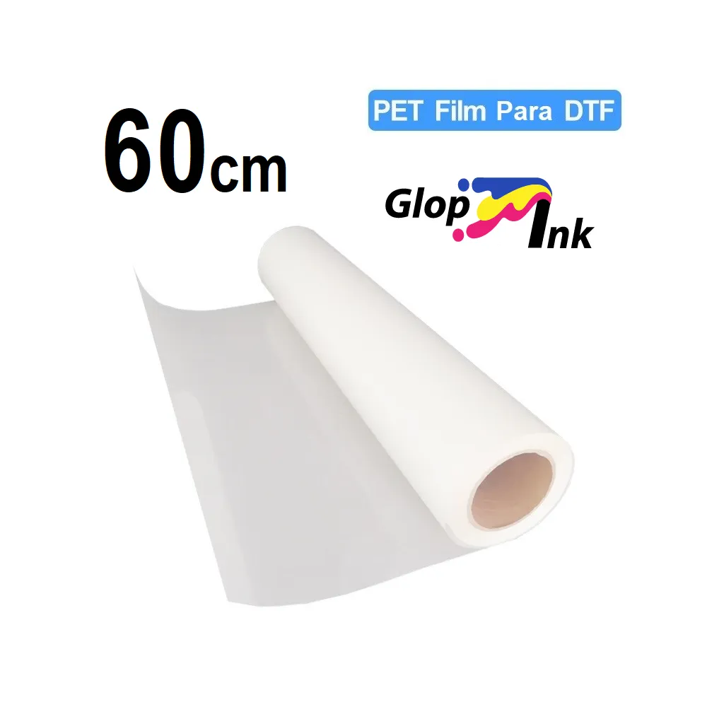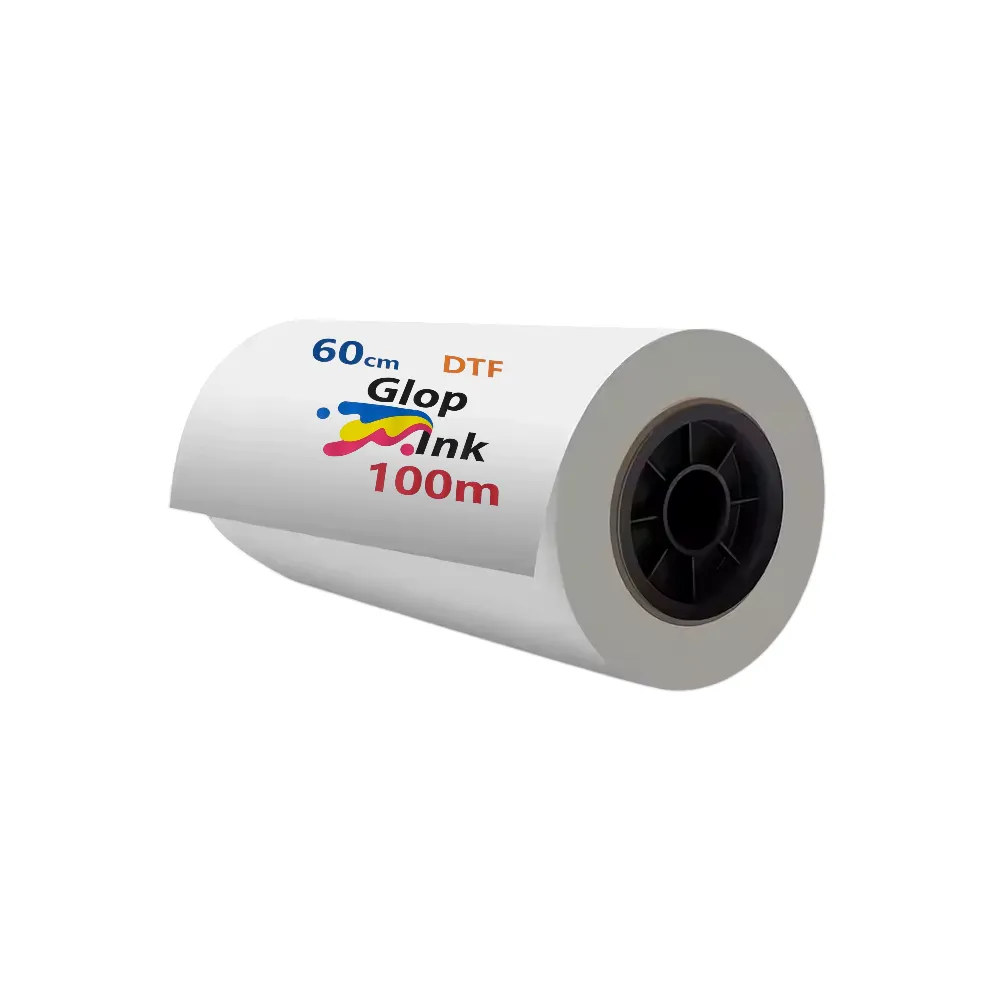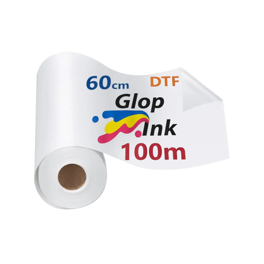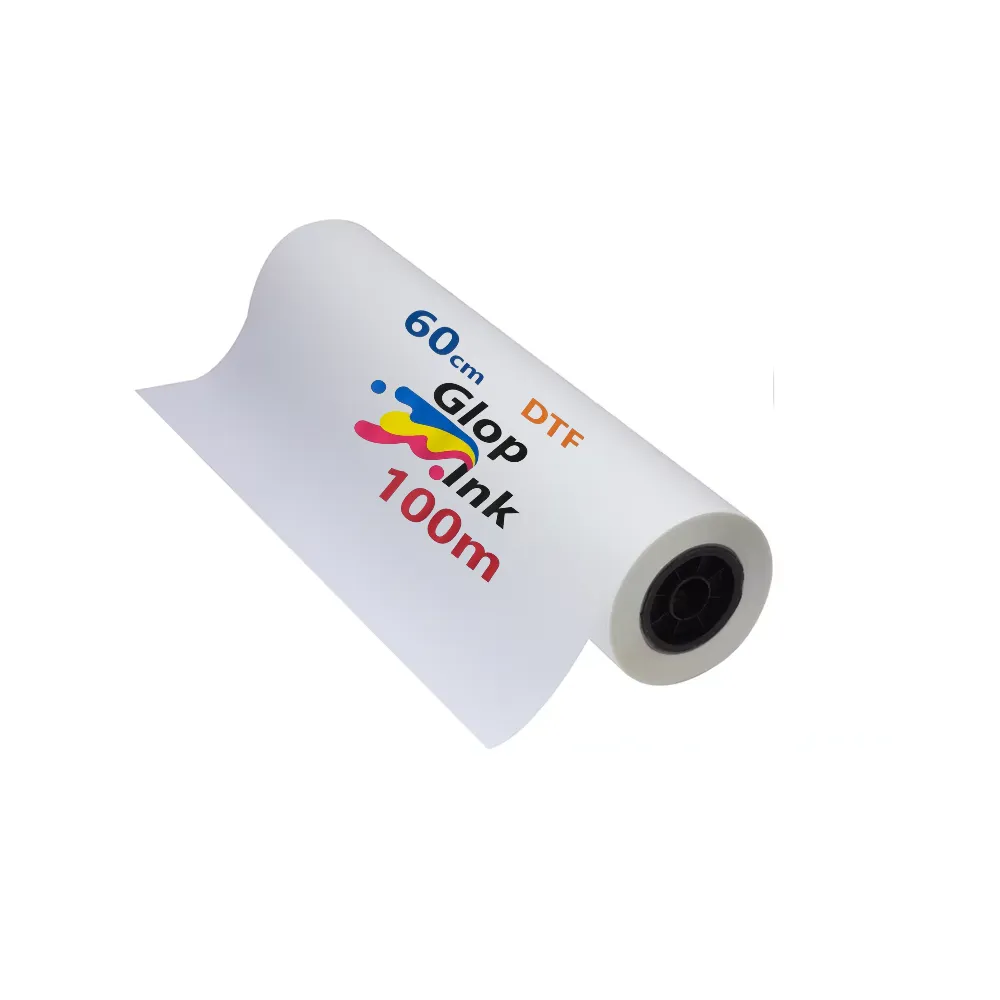 Le film de transfert DTF GlopInk de 60 cm est un film de transfert direct PET hybride qui s'imprime à froid, se durcit à la chaleur et se transfère à l'aide d'une presse à chaud. Il intègre un revêtement polymère traité à la cire qui facilite un transfert propre, uniforme et très résistant.