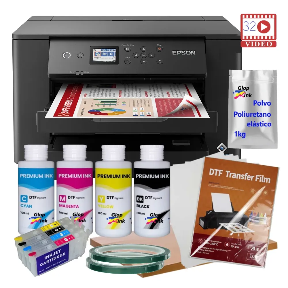Imprimante DTF4P A3 Epson WF-7310 et kit de cartouches rechargeables, film, poudres et encres DTF GlopInk. Comprend tout le nécessaire pour l'impression et la personnalisation de tout type de tissu ou mélange de tissus, de couleur blanche ou claire, t-shirts, masques, tasses, bois, cuir, bandes, bracelets et uniformes. Comprend un film DTF, de la poudre DTF, du ruban thermique et du papier protecteur siliconé.