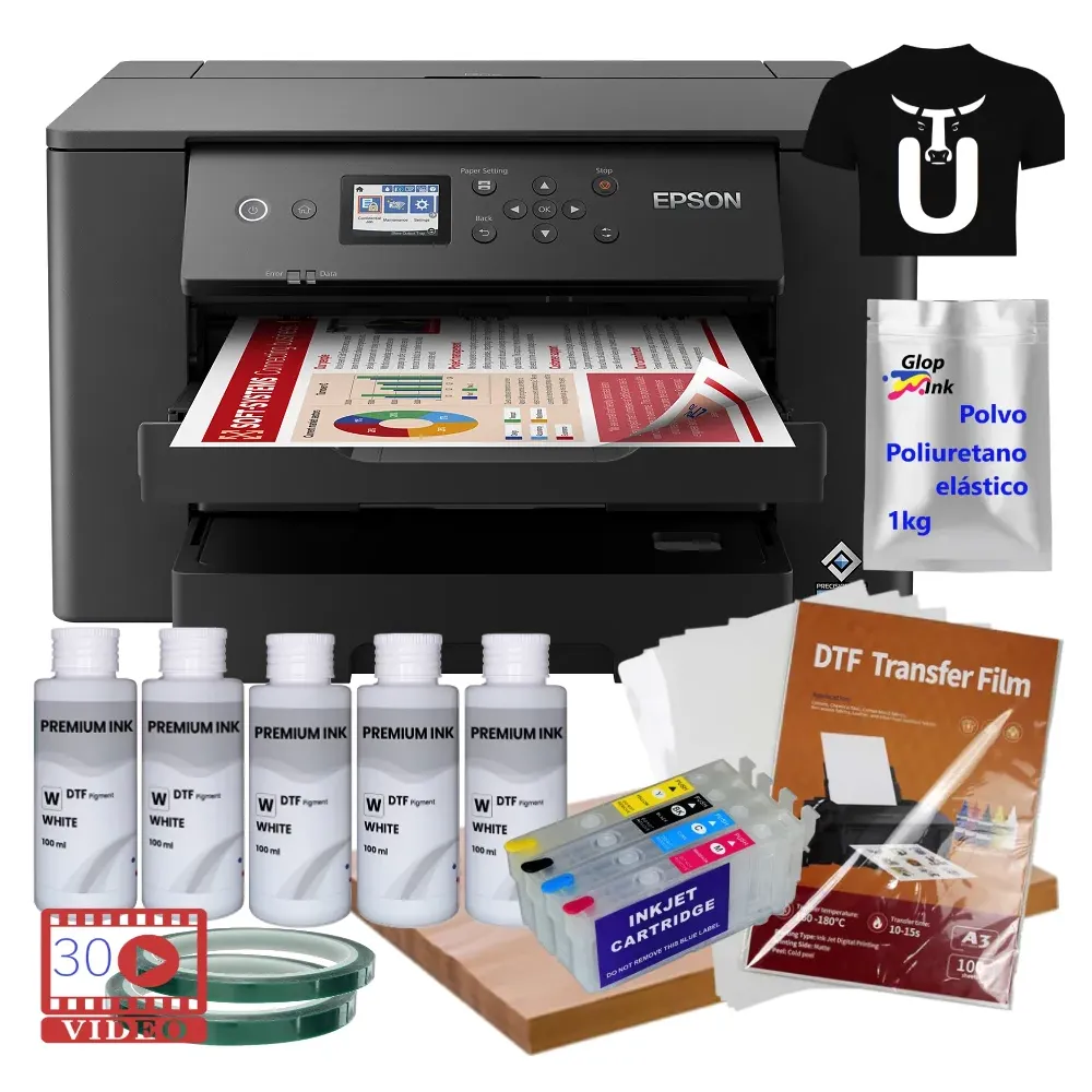 Imprimante DTF qui imprime en blanc A3 Epson WF-7310 et kit de cartouches rechargeables, film, poudres et encres DTF GlopInk. Comprend tout le nécessaire pour l'impression et la personnalisation de tout type de tissu ou mélange de tissus, de couleur noire ou de couleurs sombres, t-shirts, masques, bois, cuir, bandes, bracelets et uniformes. Comprend un film DTF, de la poudre DTF, du ruban thermique et du papier protecteur siliconé.